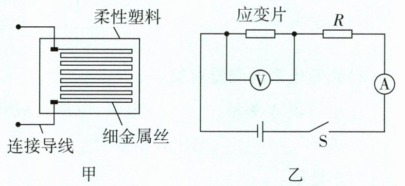 9 新情境[2023安徽中考]将一根细金属丝置入柔性塑料中,可以制成用来检测物体形变的器件应变片,其结构如图甲所示。将它接入图乙所示的电路,电源电压不变,R为定值电阻。闭合开关S,当应变片随被检测物体发生拉伸形变时,塑料中的金属丝会被拉长变细,导致电阻变大,则电路中的(