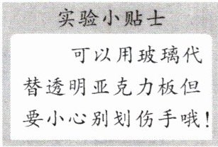 (1)小优用长尾夹分别夹住透明亚克力板底部两端,将透明亚克力板竖立在水平桌面上,接着将蜡烛和透明玻璃杯分别放置在透明亚克力板两侧,如图1所示。