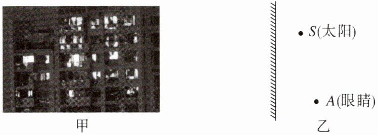 我们的生活中也有类似的现象发生。一则新闻曾记载:一位市民看到一公里外有一幢居民楼高层"着火"了,"火势猛烈",已经"烧"了好几层楼,如图甲所示。他急忙与同事讨论是否要报警,但是仔细观察发现,虽然房屋看起来像是着火了,却没有火灾中常出现的浓烟。原来这个现象主要是由平整的建筑玻璃引起光的反射造成的,加上当天夕阳的颜色比较红,造成类似火焰的视觉效果,只有处在特定角度的人才能看到,反而身处其中的人无法看到。请你在图乙中画出这位市民看到"着火"的光路图。