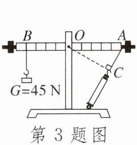 3. 如图所示,$OA= 25cm$,$OB= 20cm$,$OC= 20cm$,$AC= 15cm$,$B点所挂物体重为45N$,当杠杆水平平衡时,弹簧测力计的示数为