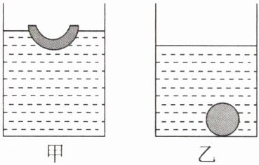 5.小金尝试只用量杯测出一块橡皮泥的密度。他进行了如下操作:在量杯中加入$V_{1}= 350mL$的水,将一块橡皮泥捏成船的形状,放入量杯中且浮在水面上,如图甲所示,读出液面位置$V_{2}= 370mL$;如图乙所示,再将橡皮泥捏成实心团完全浸入量杯中的水里,读出示数$V_{3}= 360mL$。请你算出这种橡皮泥的密度。(g取10N/kg)