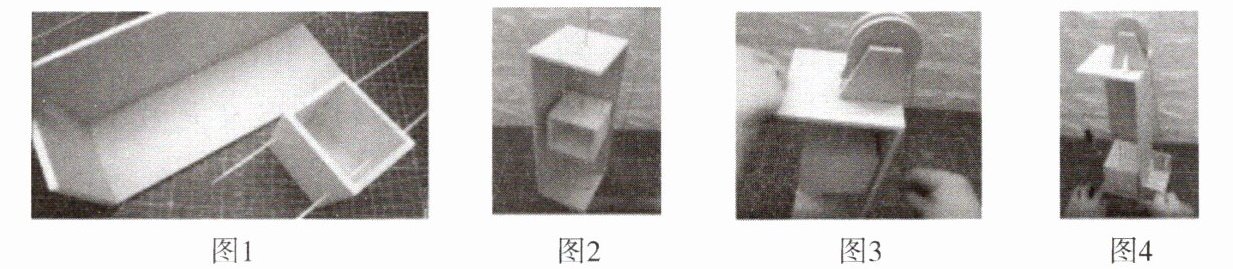 (1)剪取合适尺寸的硬纸板,制作大、小纸盒分别作为电梯井、电梯厢;再将长竹签穿过小纸盒,使小纸盒能够上下移动,如图1所示。