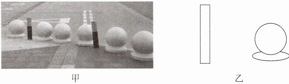 在某个贸易广场一侧,十几米的路边摆放了43个直径约50cm、高约成人小腿的球形石墩,石墩密集排列(其中部分如图甲所示),严重阻塞行人正常通行,给携带大件物品,使用轮椅、婴儿车的路人带来极大不便。为了方便行人,决定利用石墩旁边的交通警示柱搬走其中的22个,仅留下21个,你认为如何绕线会更省力?请用笔画线代替绳子在图乙中画出绕线方式并标出拉力F。