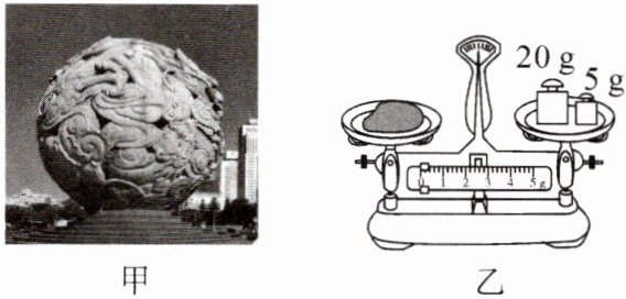 5.如图甲所示是某城市的一座雕塑,官方报告称该雕塑重18.5t,小亮想知道该雕塑的体积,于是他找到与雕塑同材质的实心石块作为样品,测量样品的质量如图乙所示,用量筒测得样品的体积是$10cm^{3}$,则样品的密度为