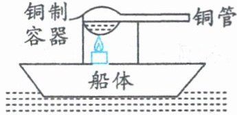 13. 如图是小明制作的简易“蒸汽船”模型。将盛有一定量水的铜制容器安装在“船体”上,用蜡烛对铜制容器底部加热。一段时间后铜管会向右喷蒸汽,“蒸汽船”就向左行驶。