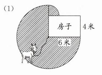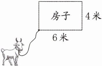 1. 一间房子的占地形状是长方形,长6米,宽4米,房子四周是草地。王爷爷将一只羊拴在房子的外墙角处(紧靠地面,如图),拴羊的绳子长6米。