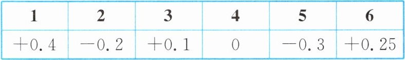 点拨:先求出各数的绝对值:$|+0.4|= 0.4$,$|-0.2|= 0.2$,$|+0.1|= 0.1$,$|0|= 0$,$|-0.3|= 0.3$,$|+0.25|= 0.25$,再比较它们绝对值的大小,绝对值越小越接近标准,所以绝对值最小的产品质量较好.