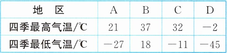 A地区的四季温差为$21-(-27)=48(^{\circ }C)$ B地区的四季温差为$37-18=19(^{\circ }C)$ C地区的四季温差为$32-(-11)=43(^{\circ }C)$ D地区的四季温差为$-2-(-45)=43(^{\circ }C)$ $48>43>20>19$ 因为B地区的四季温差不超过$20^{\circ }C$,所以B地区适合大面积栽培这种植物 解析:根据表格中的数据分别求出四个地区的四季温差,比较即可.