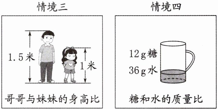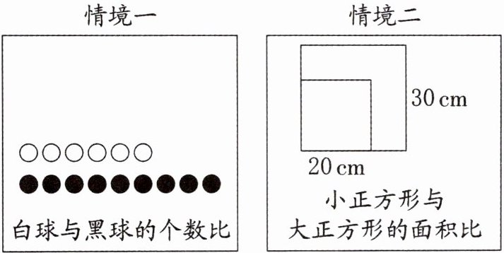 A 解析:本题考查求具体情境中两个量的比。情境一中,白球有6个,黑球有9个,白球与黑球的个数比是$6:9=2:3$;情境二中,小正方形的边长是20cm,大正方形的边长是30cm,根据正方形的面积$=$边长$×$边长,可得小正方形与大正方形的面积比是$(20×20):(30×30)=400:900=4:9$;情境三中,哥哥的身高是1.5米,妹妹的身高是1米,哥哥与妹妹的身高比是$1.5:1=3:2$;情境四中,杯中加入12g糖和36g水,糖和水的质量比是$12:36=1:3$。所以符合要求的只有情境一。