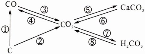 ①2C + O₂$\stackrel{点燃}{=}$2CO(合理即可,下同) ②C + O₂$\stackrel{点燃}{=}$CO₂ ③2CO + O₂$\stackrel{点燃}{=}$2CO₂ ④CO₂ + C$\stackrel{高温}{=}$2CO ⑤Ca(OH)₂+ CO₂=CaCO₃↓+ H₂O ⑥CaCO₃+ 2HCl=CaCl₂ + H₂O + CO₂↑ ⑦H₂O + CO₂=H₂CO₃ ⑧H₂CO₃=H₂O + CO₂↑