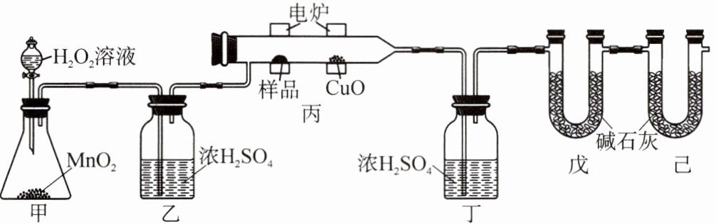 取m g该聚乙烯纤维样品进行实验,打开分液漏斗的活塞加入一定量过氧化氢溶液后关闭活塞。实验过程中观察到装置丙放CuO处有红色固体生成,样品燃烧完后只剩下灰烬(不参加反应的无机盐)。实验结束后测得装置丁、戊的质量在反应前后分别增加了$m_1g、$$m_2g($浓硫酸可以吸水,碱石灰可以吸收二氧化碳和水。装置气密性良好,夹持装置略去,装置丙处的CuO、装置乙、丁、戊、己中试剂均足量)。回答下列问题: