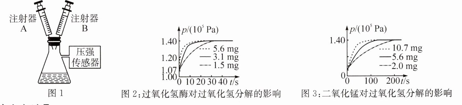 【进行实验】同学们用如图1的密闭装置分别用1.5 mg、3.1 mg、5.6 mg过氧化氢酶及2.0 mg、5.6 mg、10.7 mg二氧化锰作催化剂,其他实验条件相同,用压强传感器测得装置内压强的变化曲线如图2和图3所示。