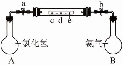 11.如图所示,烧瓶A和烧瓶B中分别充满氯化氢与氨气,且初始压强相等,在长玻璃管外壁上用记号笔做了c、d、e三个标记。同时打开弹簧夹a和b,观察到玻璃管中出现白烟。
