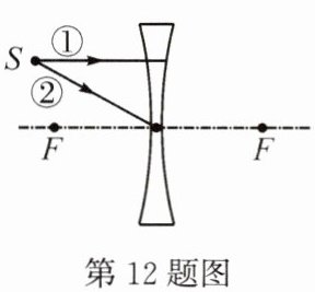 12.(2024·大庆)如图所示,光源S发出的两条光线射向凹透镜,其中光线①平行于主光轴,光线②经过光心,画出它们经过凹透镜的折射光线。