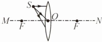 4. (黄石中考)如图所示,MN为凸透镜的主光轴,O点为光心,F点为焦点,请在图中画出三条光线的折射光线,并作出物点S的像点$S'$。(注意保留作图痕迹)