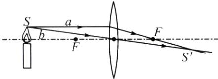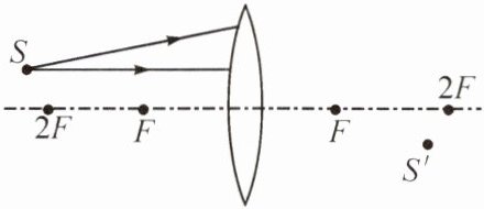 2. 如图所示,$S'$是S经凸透镜成的像,请作出由S发出的两条入射光线经凸透镜折射后的光路。