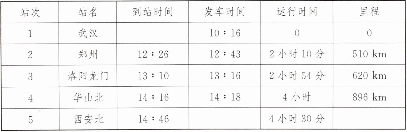 (2)解:洛阳龙门发车时间13:16,西安北到站时间14:46,运行时间t=1h30min=1.5h,速度v=240km/h,路程s=vt=240km/h×1.5h=360km,武汉到西安北全程=620km+360km=980km。