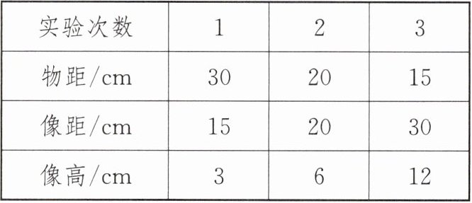 (2)将光源逐渐靠近凸透镜,移动光屏,三次成倒立实像的相关数据记录如表。分析表中数据,可得出结论:凸透镜成实像时,物距变小,像距变