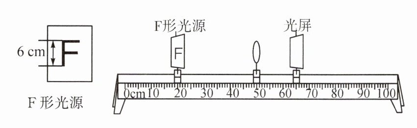5. (2024·贵州)如图所示,用焦距为10cm的凸透镜、高度为6cm的F形光源、光屏和光具座等器材探究凸透镜成像大小的变化规律,通过测量像的高度反映像的大小。