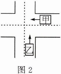 3. (长沙期中)随着汽车大量增加,交通事故也大量增加。目前发生交通事故的一个重要原因是遇到意外情况时车不能立即停下来。司机从看到情况到做动作操纵制动器来刹车需要一段时间,这段时间叫反应时间,在这段时间内汽车要保持原速前进一段距离,叫反应距离。从操纵制动器刹车,到车停下来,汽车又要前进一段距离,这叫制动距离,如图1所示。反应距离与制动距离的和称为停车距离。在如图2所示中,甲、乙两辆汽车分别在相互垂直的道路上(限速60km/h)向前匀速行驶,且车辆左侧沿各自道宽的中心线(图中虚线所示),甲车的速度为15m/s,当甲、乙两车的车头离十字路口(道路中心线)的距离分别为30m、40m时,甲车发现前方信号灯为红灯,赶快踩刹车(乙车由于司机未注意一直匀速直线行驶),若该司机的反应时间为0.7s,刹车后甲车继续滑行2.3s停止,已知该车的制动距离为19m,若两车型号相同,汽车的车长为5.1m,车宽为2m。