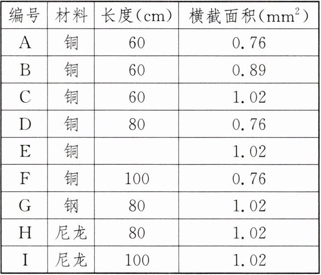 。|编号|材料|长度(cm)|横截面积$(mm^2)$|