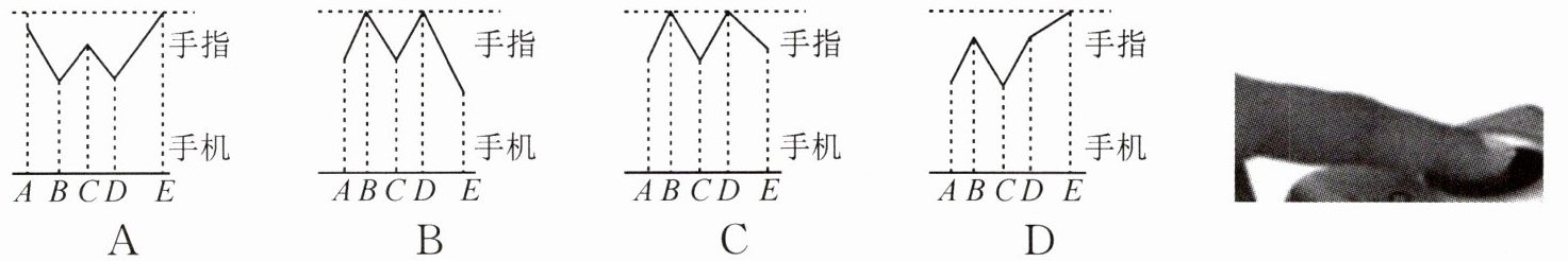19. (南通联考)如图所示,手机内置有超声波识别系统,手机发出超声波遇到手指上凹凸不平的指纹A、B、C、D、E五个位置,测得回收信号的时间分别为0.27ms、0.41ms、0.27ms、0.41ms、0.19ms,可求出手指与手机平面的距离,则该处指纹的大致形状是(