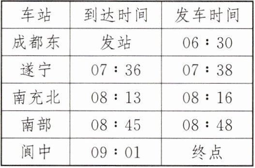 15. (杭州模拟)阆中是中国历史文化名城,阆中不仅有汉桓侯祠、中天楼、滕王阁、锦屏山等风景名胜,还有中国保存最完好、面积最大的科举博物馆,全国罕见的科举文化体验胜地——贡院。小田一家国庆节期间从成都东站出发乘火车去阆中旅游,已知成都东到阆中铁路全程293km,他们乘坐的C5804次列车时刻表如表所示。求:
