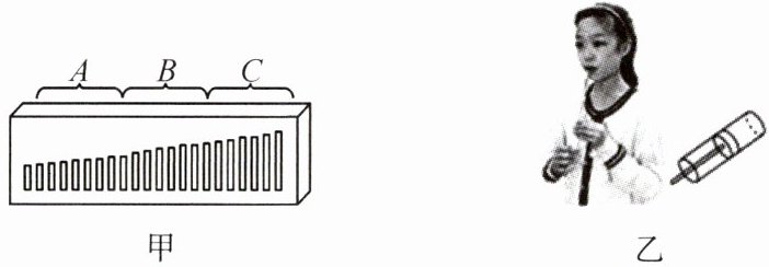 8. 口琴是用嘴吹或吸气,使金属簧片振动发声的多簧片乐器。如图甲所示是将口琴拆开后其内部的琴芯结构,在琴芯的气孔边分布着长短、厚薄都不同的一排铜片,A区的较薄、较短,而C区的较长、较厚。