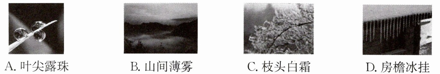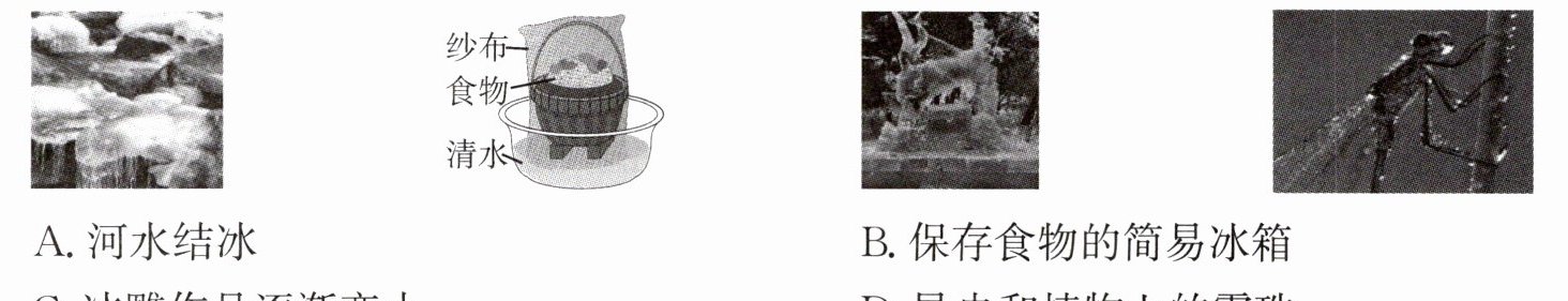 2. (2024·江岸模拟)满山银光耀眼,千岩琉璃,万树晶莹,是出现在武汉的“冰雪世界”。2024年2月4日,受冻雨影响,武汉市大部分树木都穿上了“冰盔甲”,如图所示。下列实例中,与“冰盔甲”的形成原理相同的是(