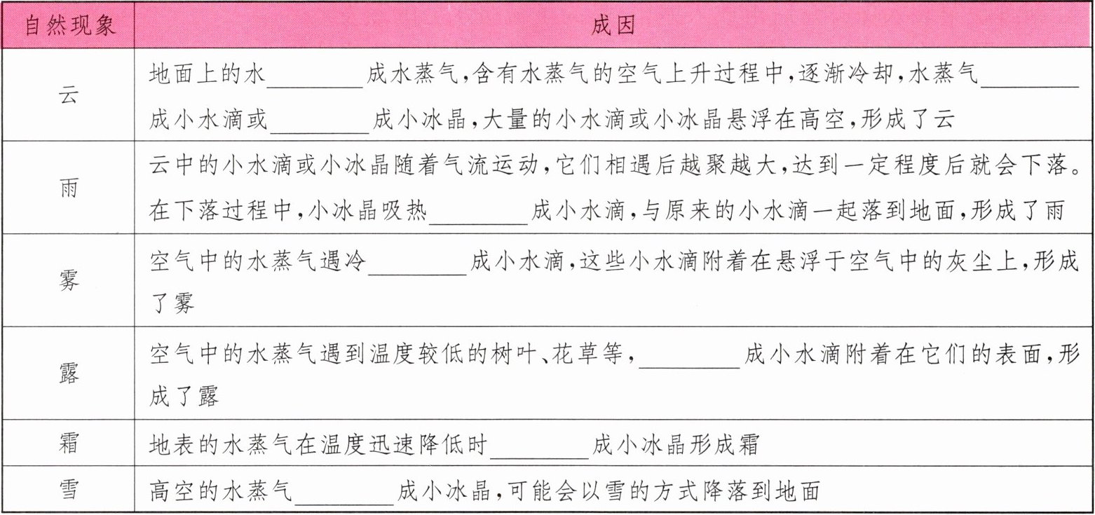 成小冰晶,可能会以雪的方式降落到地面|1. (2024·洪山联考)歌词“水是前世的云,云是来生的水”描绘了大自然中水的美丽轮回,雾、露、霜、雪也是地球上的水在不停地循环中常见的自然现象,下列关于它们的说法正确的是(