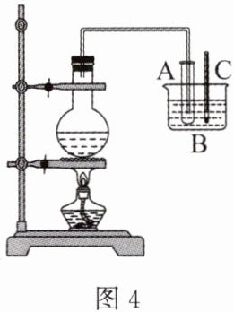 (6)另一组同学将沸腾的水倒入烧瓶,继续探究液化现象,实验装置如图4(C是温度计)。将烧瓶内水沸腾时产生的水蒸气通入试管A中,试管A放在装冷水的容器B内,过一段时间,观察到试管A中产生少量的水,这是由于水蒸气发生