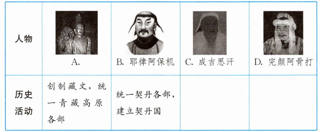 10.(1)A. 松赞干布。C:统一蒙古草原,建立蒙古政权;D. 统一女真各部,建立大金。