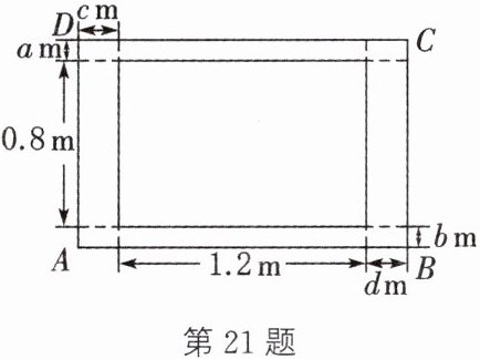 21. (10 分)新考向 传统文化(常州中考)书画装裱是为书画配上衬纸、卷轴,以便张贴、欣赏和收藏,是我国具有民族传统的特殊艺术. 如图,一幅书画在装裱前的尺寸是$1.2m×0.8m$. 装裱后,上、下、左、右边衬的宽分别是 a m,b m,c m,d m. 若装裱后 AB 与 AD 的长度之比是$16:10$,且$a= b,c= d,c= 2a$,求四周边衬的宽.