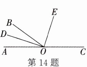 14. 如图,$ \angle AOB $ 和 $ \angle BOC $ 互为邻补角,且 $ \angle BOC : \angle AOB = 4 : 1 $,射线 $ OD $ 平分 $ \angle AOB $,射线 $ OE \perp OD $,则 $ \angle BOE $ 的度数为