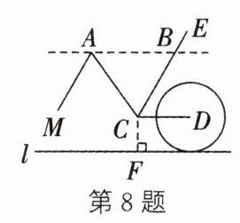 8. 新情境 日常生活 某市为了方便市民绿色出行,推出了共享单车服务. 如图所示为某共享单车的局部示意图,$ AB $,$ CD $ 都与地面 $ l $ 平行,$ \angle BCD = 60 ^ { \circ } $,$ \angle BAC = 54 ^ { \circ } $. 当 $ AM // CB $ 时,$ \angle MAC $ 的度数为 (