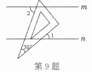 9. (巴中中考)如图,直线$m// n$,一块含有$30^{\circ }$角的三角尺按如图所示的方式放置.若$∠1= 40^{\circ }$,则$∠2$的度数为 (