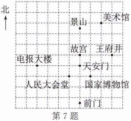7. 新情境 地理位置 如图所示为利用平面直角坐标系画出的天安门广场周围的景点分布示意图.若此平面直角坐标系分别以正东、正北方向为$x$轴、$y$轴的正方向,表示电报大楼的点的坐标为$(-4,0)$,表示王府井的点的坐标为$(3,1)$,则表示下列景点的点的坐标正确的是((