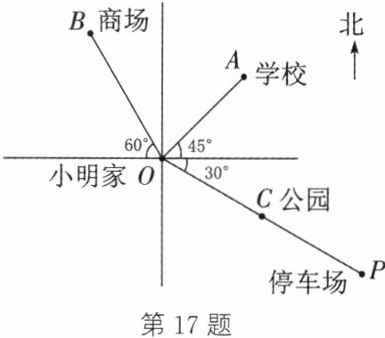 17.(10分)情境题 地理位置 如图所示为小明家和学校所在地的简单地图,且$OA= 2cm$,$OB= 2.5cm$,$OP= 4cm$,$C为OP$的中点.