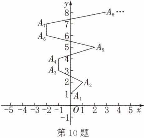 10. 类比归纳思想 如图,在平面直角坐标系中,原点$O$第一次跳动到点$A_{1}(0,1)$,第二次从点$A_{1}$跳动到点$A_{2}(1,2)$,第三次从点$A_{2}$跳动到点$A_{3}(-1,3)$,第四次从点$A_{3}$跳动到点$A_{4}(-1,4)$……按此规律进行下去,点$A_{2025}$的坐标是(