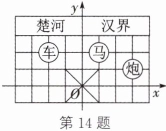 14. 新考向 传统文化 (台州中考)在象棋棋盘(部分)中建立如图所示的平面直角坐标系.已知“车”所在位置的坐标为$(-2,2)$,则“炮”所在位置的坐标为______.