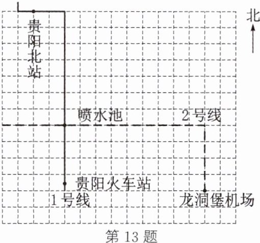 13. 情境题 地理位置 (贵州中考)如图所示为贵阳市城市轨道交通运营的部分示意图.若以喷水池为原点,分别以正东、正北方向为$x$轴、$y$轴的正方向建立平面直角坐标系,贵阳北站的坐标是$(-2,7)$,则龙洞堡机场的坐标是______.