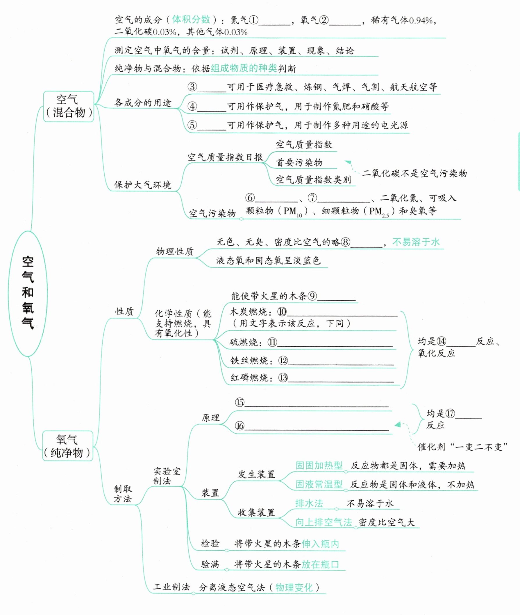 ①78% ②21% ③氧气 ④氮气 ⑤稀有气体 ⑥二氧化硫 ⑦一氧化碳 ⑧大 ⑨复燃 ⑩碳+氧气$\xrightarrow{\text{点燃}}$二氧化碳 ⑪硫+氧气$\xrightarrow{\text{点燃}}$二氧化硫 ⑫铁+氧气$\xrightarrow{\text{点燃}}$四氧化三铁 ⑬红磷+氧气$\xrightarrow{\text{点燃}}$五氧化二磷 ⑭化合 ⑮高锰酸钾$\xrightarrow{\text{加热}}$锰酸钾+二氧化锰+氧气 ⑯过氧化氢$\xrightarrow{\text{二氧化锰}}$水+氧气 ⑰分解