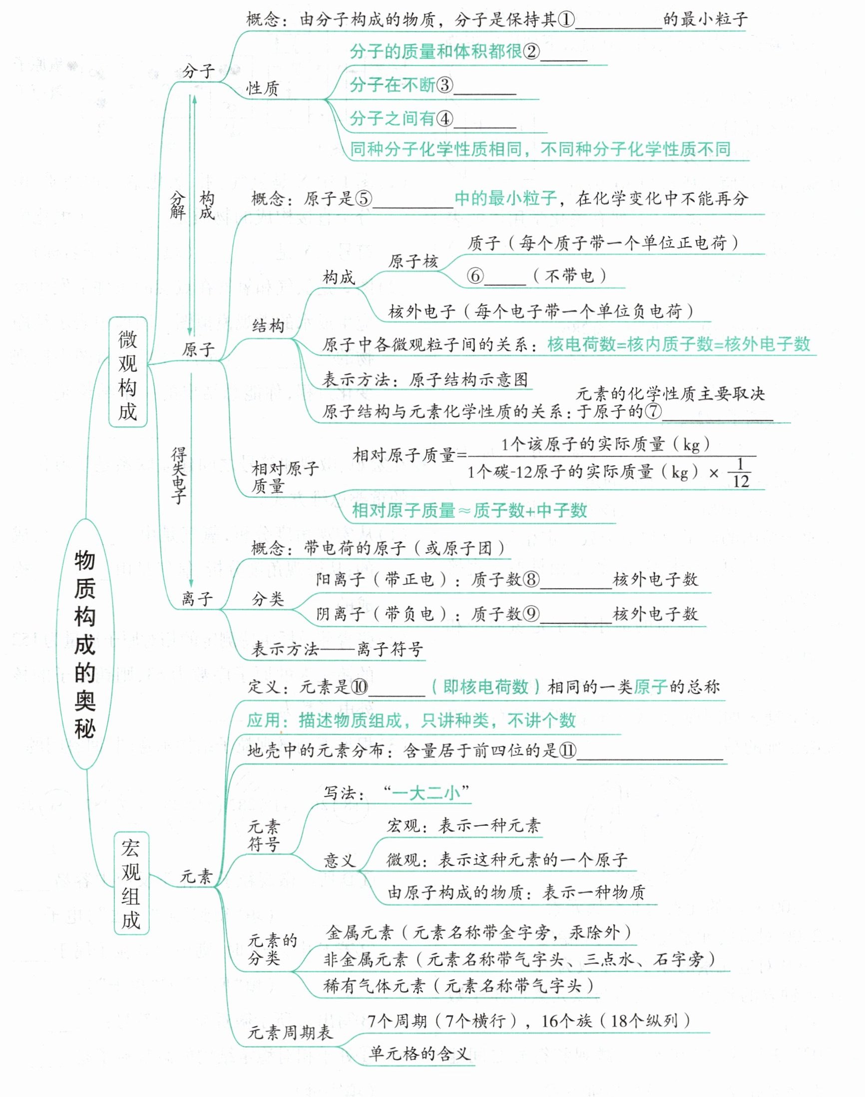 ①化学性质 ②小 ③运动 ④间隔 ⑤化学变化 ⑥中子 ⑦最外层电子数 ⑧> ⑨< ⑩质子数 ⑪O、Si、Al、Fe(或氧、硅、铝、铁)