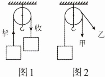 1 [新导向·古代文化][2024盐城汇杰初级中学月考]现有史籍中最早讨论滑轮的是《墨经》。书中将向上提举重物的力称为“挈”,将自由往下降落的力称为“收”,将整个滑轮称为“绳制”(图1)。现分别用甲、乙两个力替代“收”(图2),使重物在相同的时间内匀速上升相同的高度。不计绳重和摩擦,下列说法正确的是(
