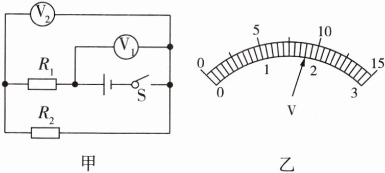 4 [2025淄博八中月考]在如图甲所示电路中,在闭合开关后,两个电压表指针偏转均为图乙所示,通过$R_{1}和R_{2}$的电流之比是