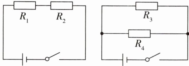 左图中R₁、R₂串联,设R₁两端的电压为U₁,R₂两端的电压为U₂;右图中R₃、R₄并联,设R₃两端的电压为U₃,R₄两端的电压为U₄。由串联电路的电压特点可知U₁、U₂都小于电源电压U;由并联电路的电压特点可知U₃、U₄都等于电源电压U,且R₃ > R₄。因为R₁、R₂的电阻较大,所以由公式W = U²t/R可知,相同时间内R₁、R₂消耗的电能比R₃、R₄少;由公式W = U²t/R可知,相同时间内R₃消耗的电能比R₄少。相同时间内消耗电能最多的电阻是R₄。