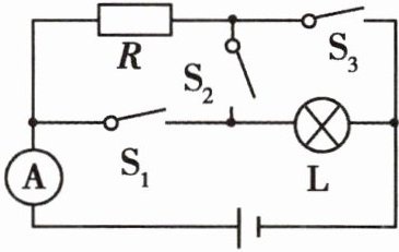6 如图所示电路图,灯泡标有“6 V 1.2 W”字样,R是定值电阻,断开开关$S_2,$闭合开关$S_1$和$S_3,$灯泡正常发光,电流表的示数为0.50 A。