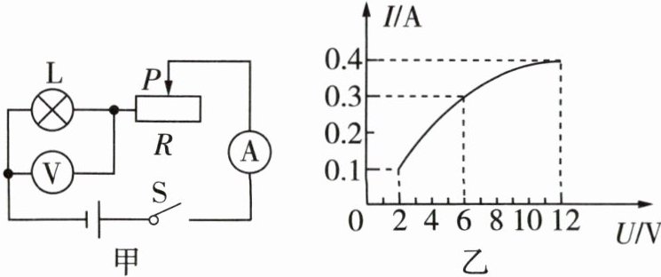 5 [2024西安理工大学附中期中]在如图甲所示的电路中,电源电压恒定不变,闭合开关S后,滑动变阻器R的滑片P从一端滑到另一端的过程中,电流表示数I与电压表示数U的关系图像如图乙所示,且滑片P在其中一端时小灯泡L恰好正常发光。下列说法正确的是(