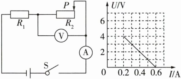 4 如图所示,电源电压保持不变,闭合开关S,滑动变阻器$R_{2}$的滑片P由最右端移到最左端,得到两电表示数的U-I图像。下列有关说法正确的是(