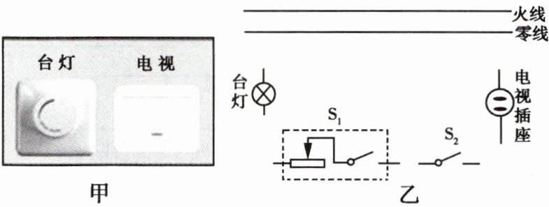 3 “五一”假期小真去旅游,晚上住在某宾馆,观察到床头柜上有台灯、电视的控制开关(如图甲),小真用所学知识绘制了图乙所示的控制电路图,其中$S_{1}$为旋钮开关,单独控制台灯的通断和亮度;$S_{2}$为单独控制电视插座的开关。请将图乙连接完整,要求符合安全用电原则。